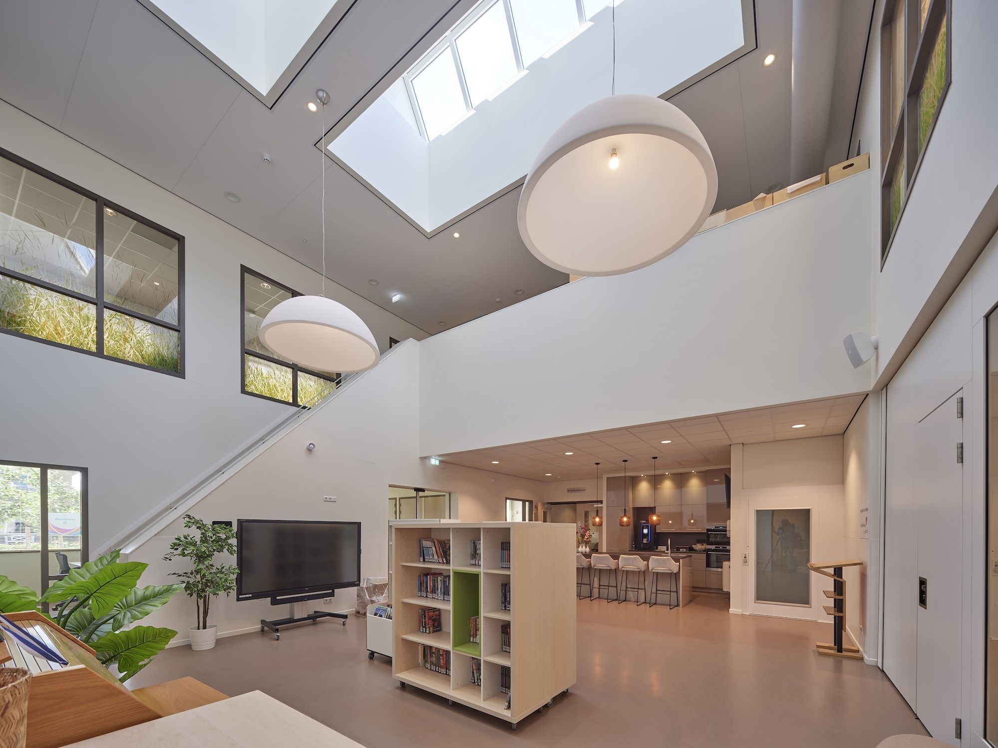 Naast de onderwijs- en opvangruimtes vormt de grote gemeenschappelijke hal het kloppend hart van het gebouw. Hier vinden bijeenkomsten plaats voor leerlingen, ouders, lokale verenigingen en kerkenraden maar is ook de ‘Bieb op School’ gerealiseerd – een samenwerking met de lokale bibliotheek om het lezen te bevorderen. Het bestuurskantoor draagt met haar vergaderruimten verder bij aan het multifunctionele gebruik van het MFA.